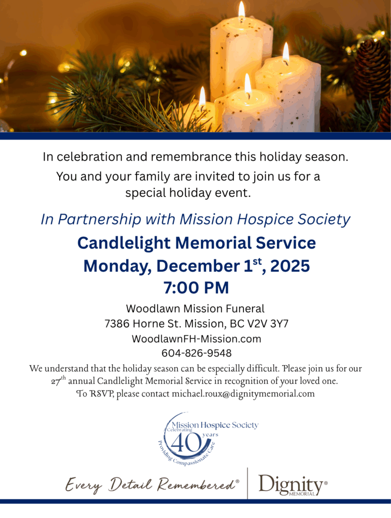In partnership with Mission Hospice Society, a candlelight memorial service will be held at Woodlawn Mission Funeral Home on Monday, December 1, 2025, at 7:00 PM.